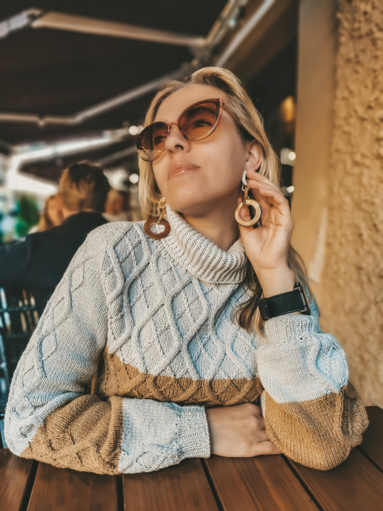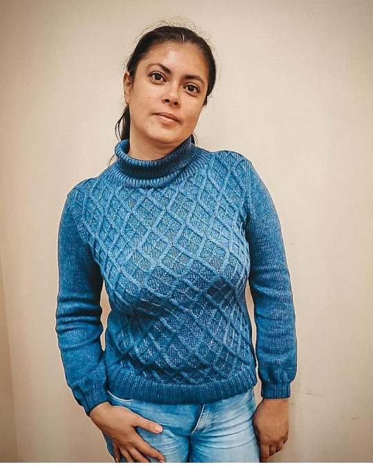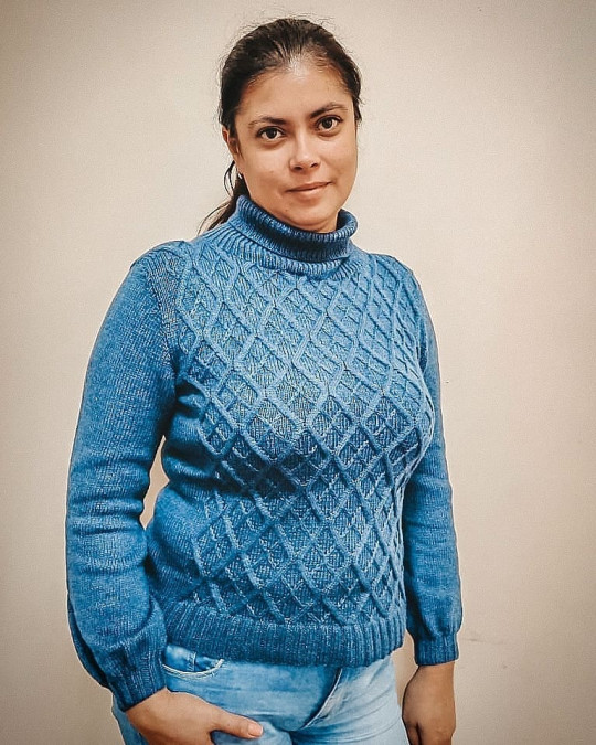 Свитер свободного облегания вяжется снизу вверх.
